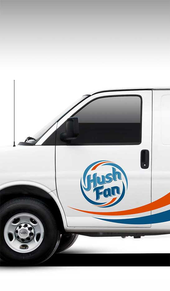 Hush Fan combines silence with performance through a custom identity designed to embody "quiet and calm" cooling. The logo features a blue wind graphic to illustrate fresh airflow, contrasted by a red accent representing heat dissipation, creating a reliable and "cool" brand that communicates efficiency at a glance.